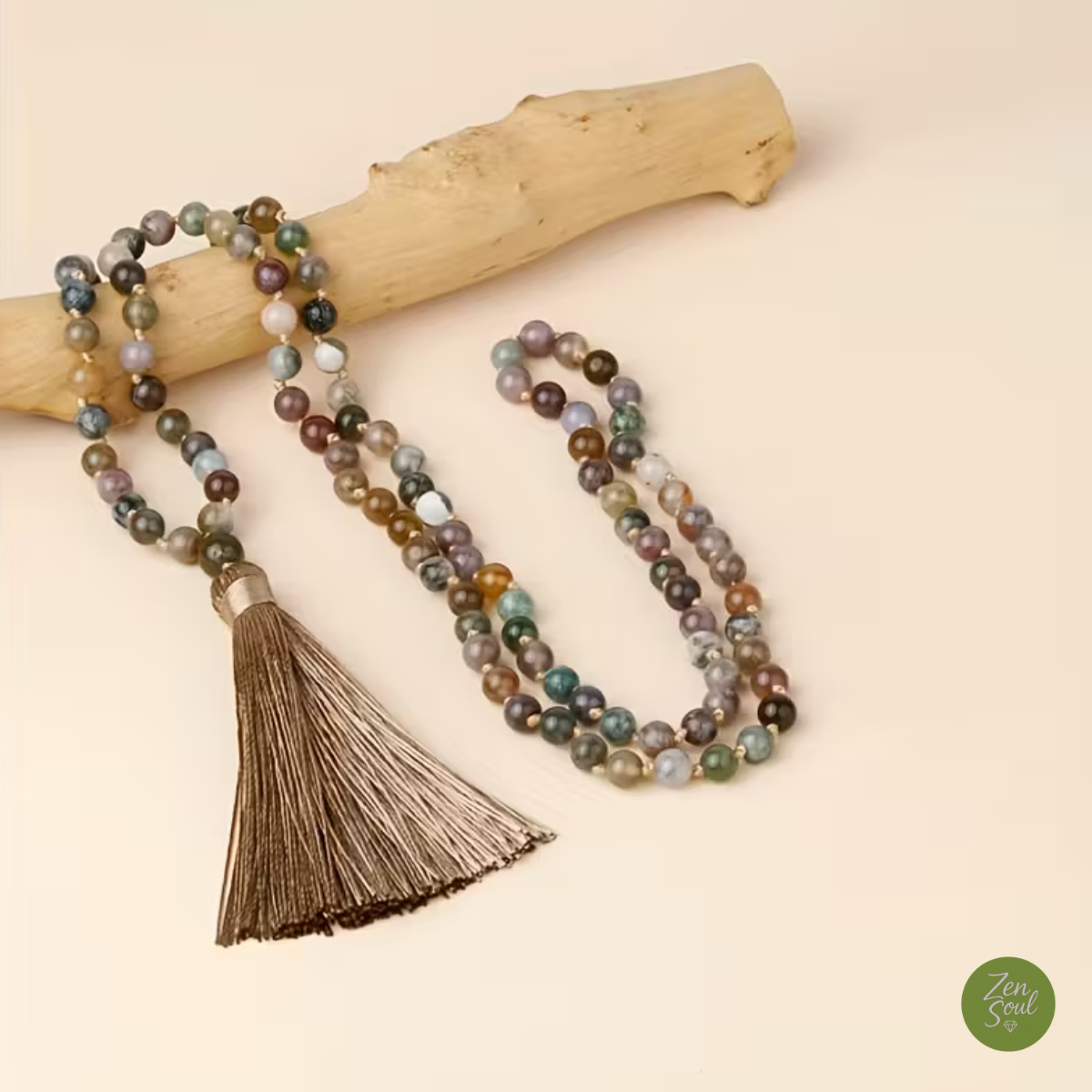 Ez az 108 szemes, 6 mm-es indiai achát gyöngyökből készült mala a belső egyensúly, az elfogadás és az önismereti út támogatója. Minden egyes gyöngy finoman emlékeztet arra, hogy az élet útja nem mindig egyenes – de minden lépés tanít valamire.