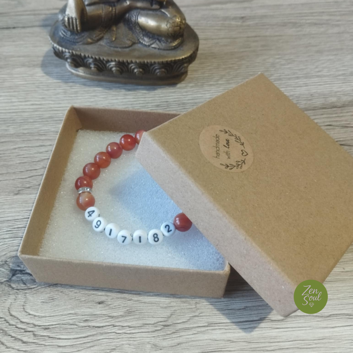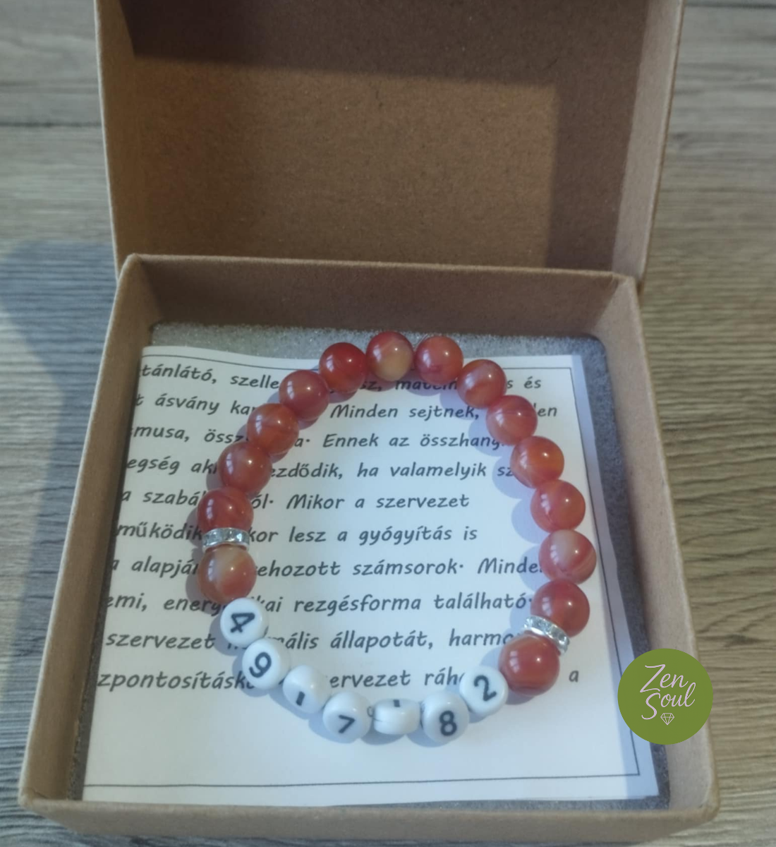 A karkötő természetes 8 mm-es piros karneol ásványból készült, amely a bátorság, a szenvedély, az önbizalom és az élni akarás köve.